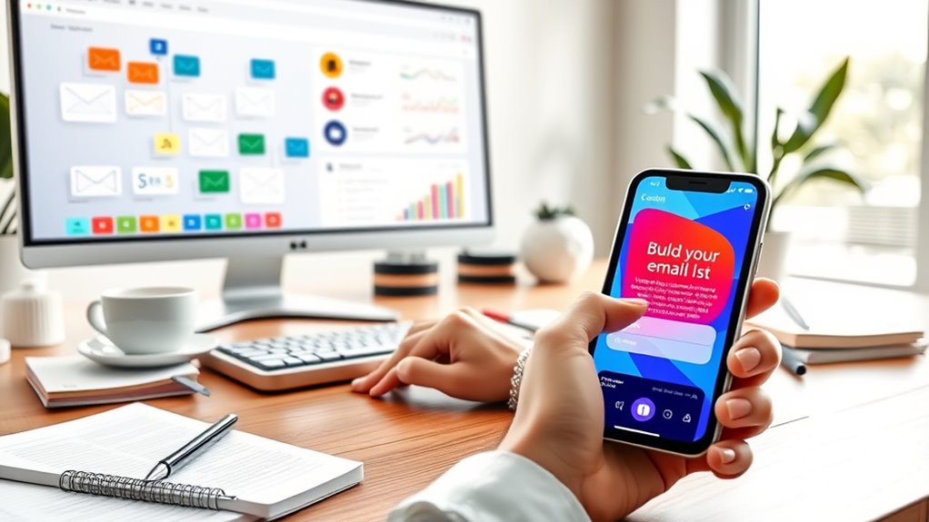 Imagine your email list as a garden blooming with enthusiastic subscribers. To grow it quickly and ethically, showcase social proof like testimonials to build trust. Offer personalized content that feels tailored just for them, sparking genuine interest. Promote sign-ups through valuable freebies, social media, and your website. Engage authentically, and your list will flourish naturally, attracting subscribers who genuinely want to hear from you.