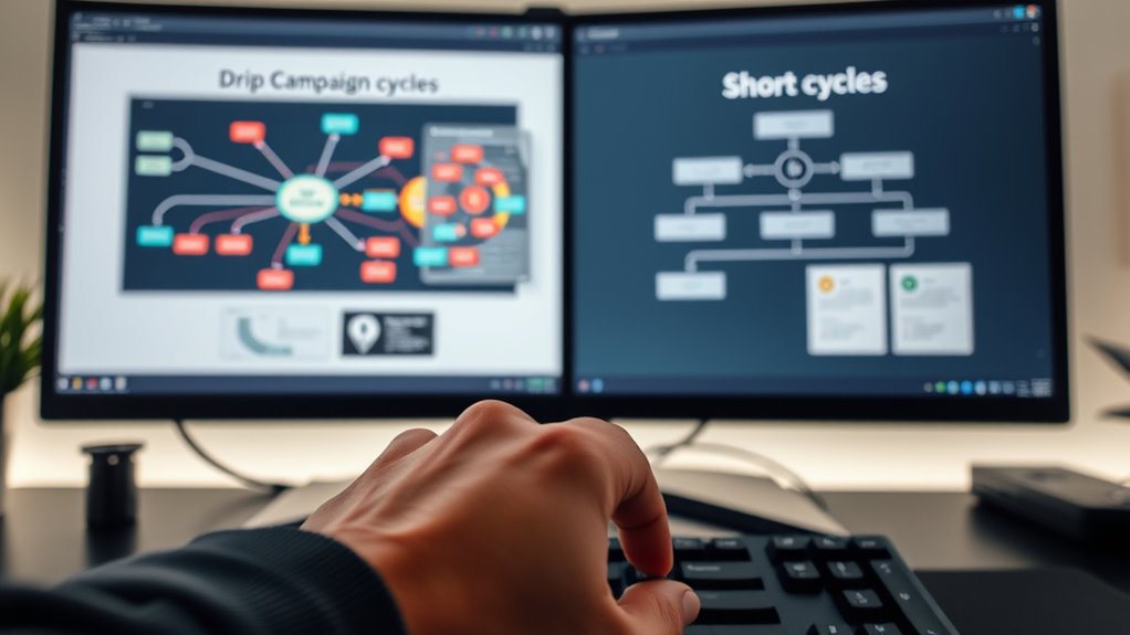 To adapt your drip campaigns for long or short sales cycles, focus on tailored messaging that aligns with your prospects’ decision stages. For long cycles, nurture leads with valuable content and relationship-building activities, maintaining consistent engagement over time. For short cycles, use direct, action-oriented messages with clear calls to action to prompt quick decisions. Understanding these strategies helps you optimize your campaigns. Keep exploring to discover how to make your drip campaigns even more effective for your sales goals.