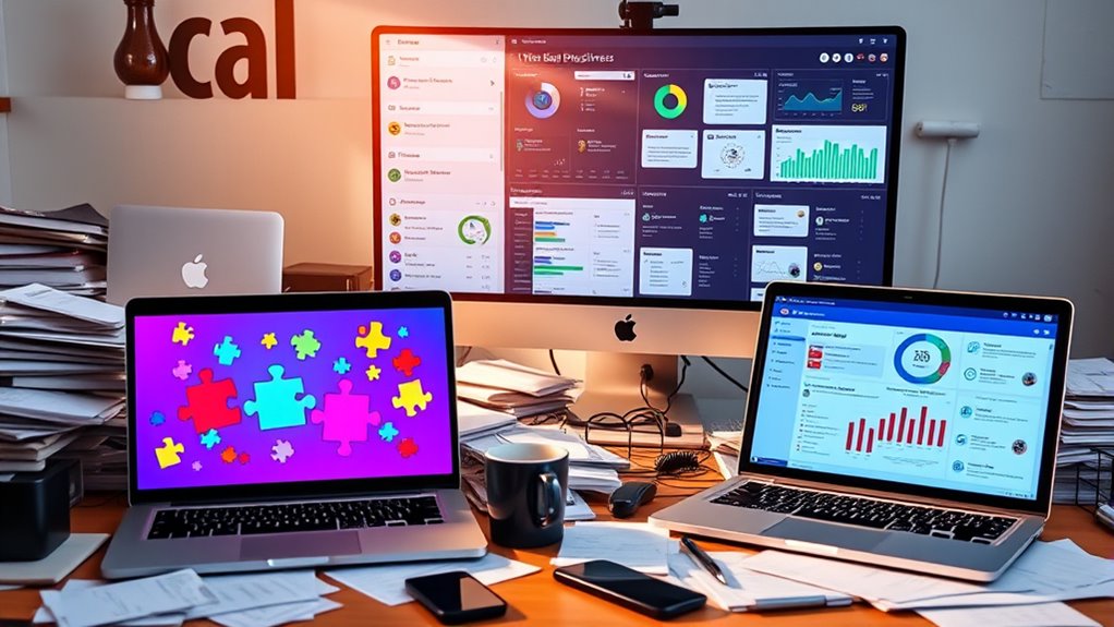For small businesses, email plugins are easy to set up and integrate with your current tools, making them suitable if you have limited resources. However, dedicated platforms offer advanced features like segmentation, automation, and better analytics, helping you scale effectively. While they require a steeper learning curve and investment, they provide more personalized campaigns and consistent messaging. Keep exploring to see which solution best fits your growth plans and how to maximize your email marketing efforts.