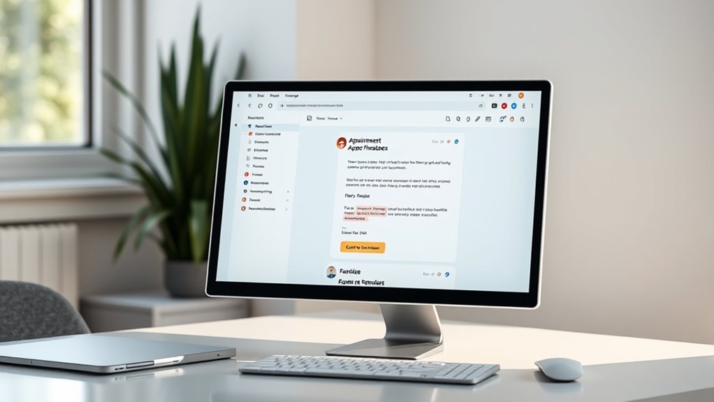 To reduce no-shows, craft a personalized appointment reminder email with a clear call-to-action, like a “Confirm Appointment” button or link, making it easy for clients to respond. Use their name and appointment details to show attention and include options to reschedule or cancel smoothly. Keep the tone professional yet friendly, and consider multiple confirmation methods. Continuing with these strategies will help you create effective reminders that boost attendance and strengthen client trust.