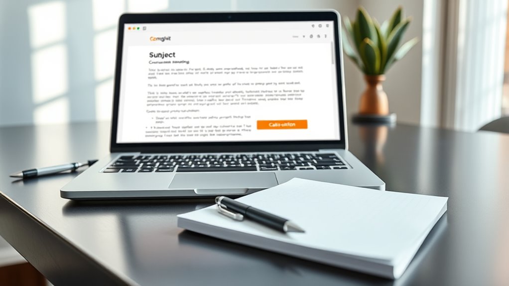 To structure a professional email effectively, start with a clear, specific subject line that captures the message’s purpose. Use a respectful greeting, addressing the recipient by name if possible. Keep the body concise and organized with short paragraphs and possibly bullet points, clearly stating your main point early. Finish with a direct call to action, specifying exactly what you want next. Mastering these parts will help your messages be well-understood and prompt timely responses. If you continue, you’ll discover more tips to refine your email skills.