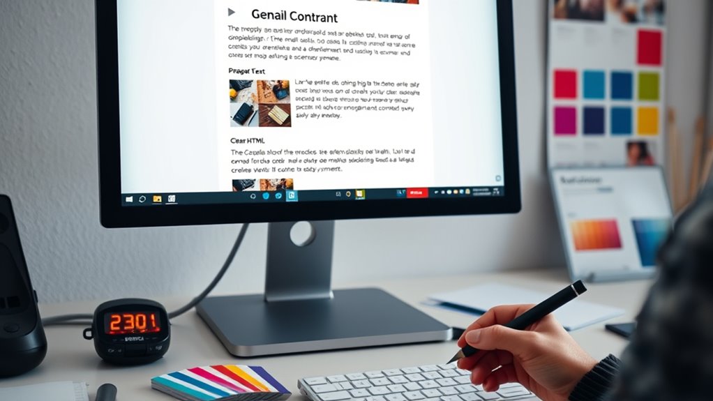 To design accessible emails, focus on creating strong color contrast between text and backgrounds, making sure all images include descriptive alt text to support screen readers, and use semantic HTML tags like