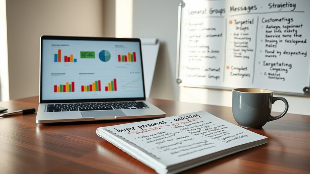 To define buyer personas and segments for targeted email campaigns, start by gathering real data on your customers’ demographics, habits, challenges, and goals. Use this info to create profiles that clarify who your ideal buyers are and what they value. Segment your email list based on these personas, such as new leads or loyal customers, to craft relevant messages. Next, incorporate industry insights to make your campaigns even more precise—keep exploring to discover more effective strategies.