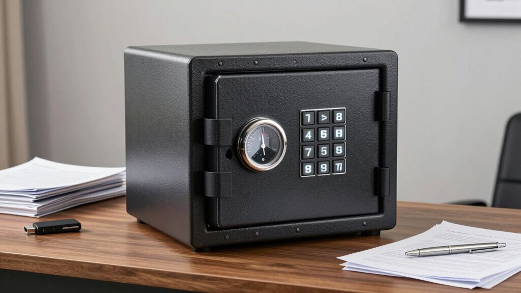 Personal safety is another crucial aspect that often gets overlooked. When selecting a fireproof safe, make sure it’s designed with features that prioritize your safety during an emergency. Look for safes with easy-to-operate locks and clear instructions, so you can quickly access your documents if needed. Some safes come with biometric or digital locks, which add an extra layer of security but should also be simple enough to open under stress. Additionally, safes with sturdy handles and lightweight construction can be moved easily in case you need to evacuate quickly, ensuring your personal safety isn’t compromised in the chaos of a fire. Incorporating fire safety features can also enhance the overall protection and usability of your safe during emergencies. Being aware of the piercing options for safes—such as reinforced steel or lock mechanisms—can further improve their resilience against attempted tampering or break-ins during an emergency. Furthermore, choosing a safe with fireproof construction means it’s built to withstand not only heat but also potential impacts or attempts at forced entry, adding an extra layer of security. It’s equally important to consider the overall construction quality to ensure longevity and reliable performance over time.