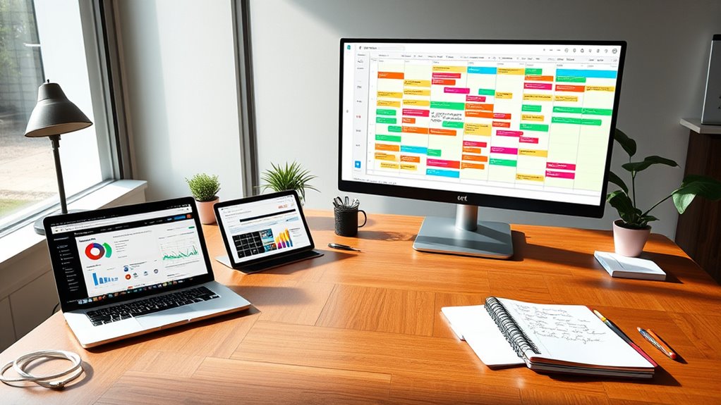 Creating a unified content calendar that incorporates email, social, and SEO elements requires a strategic approach. Start by mapping out your key content themes and publication dates. Use tools that offer integrations with email marketing platforms and social media management tools, so updates are seamless. As you plan, consider how each piece of content supports your overall marketing funnel—whether it’s raising awareness, nurturing leads, or converting customers. This holistic view guarantees that your messaging is coherent and that each channel amplifies your efforts.