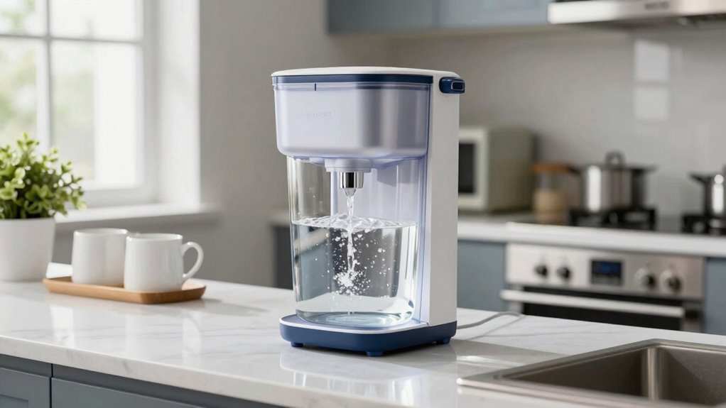 You should replace your countertop water filter every 6 to 12 months, depending on its filter lifespan and your water usage. Check the manufacturer’s recommendations for ideal replacement frequency, as heavy use may require more frequent changes. Keep an eye on the filter’s performance; if water flow slows or taste deteriorates, it’s time for a replacement. Regularly replacing the filter guarantees clean, fresh-tasting water.