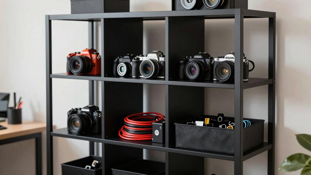 Imagine a lightweight, flexible bird that effortlessly flits from place to place—that’s what portable solutions offer for your gear. You’ll find many mobile storage options designed for creators on the move, featuring wheels or foldable elements. These shelves are perfect for quickly adapting your workspace, ensuring your gear stays organized and accessible wherever inspiration strikes. With the right mobile storage, you keep your creative flow smooth and adaptable.