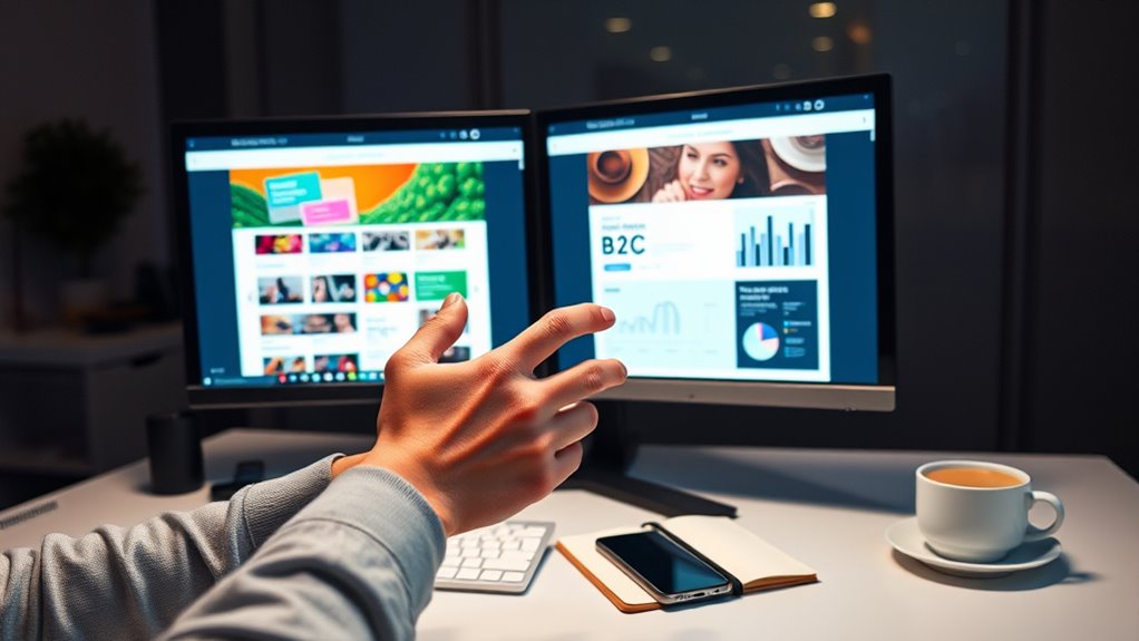 When choosing an email platform for B2C or B2B needs, consider your audience and goals. For B2C, you’ll want a platform that excels at broad personalization, engaging content, and automation like cart reminders or discounts. For B2B, focus on platforms that support deep segmentation, detailed targeting, and complex workflows to nurture relationships with decision-makers. Understanding these differences helps select the right tool—keep exploring to discover which platform aligns best with your strategies.