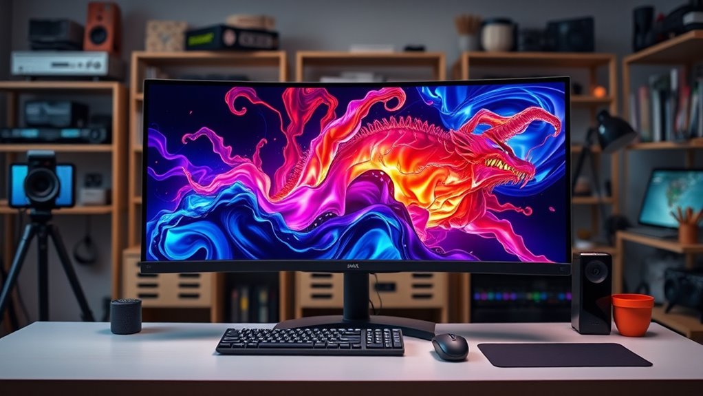 Absolutely, some models support hardware calibration for professional color grading—it’s like having a personal color scientist at your fingertips. I’ve found that monitors like the Eizo ColorEdge series and the BenQ SW series are premier, offering built-in calibration sensors and extensive color accuracy controls. These features guarantee your work remains consistently precise, making them ideal for serious content creators who demand perfection in every hue and shade.