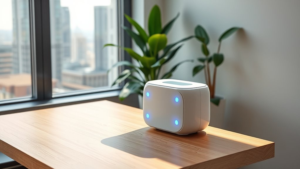 Smart technology features have become a key factor in choosing the right air purifier for your home office because they offer added convenience and control. With WiFi connectivity, you can control and schedule your purifier remotely via smartphone apps, making adjustments easy from anywhere. Voice assistant compatibility with Alexa or Google Assistant allows for hands-free operation, so you can just speak commands. Real-time air quality monitoring keeps you informed and enables automatic fan speed adjustments to maintain ideal conditions without manual effort. Integration with smart home ecosystems lets you create routines that coordinate your air purifier with other devices. Plus, notifications and filter replacement alerts through apps ensure timely maintenance, keeping your purifier effective and saving you from unexpected breakdowns.