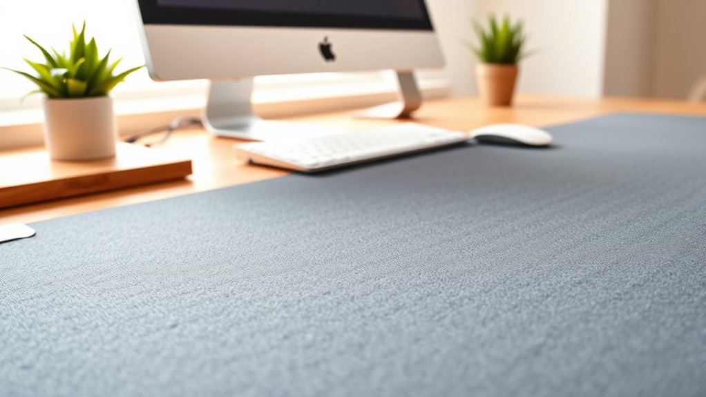 The right size and compatibility of an anti-fatigue desk mat are essential for guaranteeing comfort and safety during your workday. I recommend measuring your standing area to ensure the mat fits well and prevents tripping hazards. Consider the mat’s height to provide enough cushioning without raising your feet too high, which helps maintain a natural posture. If you wear bulky shoes or boots, choose a size that accommodates your footwear comfortably. Think about your tasks—larger mats are ideal for extended standing periods, while smaller ones work better in limited spaces. Additionally, verify that the mat’s size allows for easy repositioning and storage when not in use. Proper sizing ensures your workspace remains safe, comfortable, and adaptable to your needs.