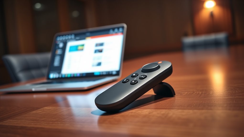 When choosing a Bluetooth presentation remote, I consider factors like device compatibility, wireless range, and battery life to guarantee smooth presentations. Control features and ease of setup also matter, so I can focus on delivering my message without technical hiccups. Knowing what to prioritize helps me pick a remote that fits my needs perfectly.