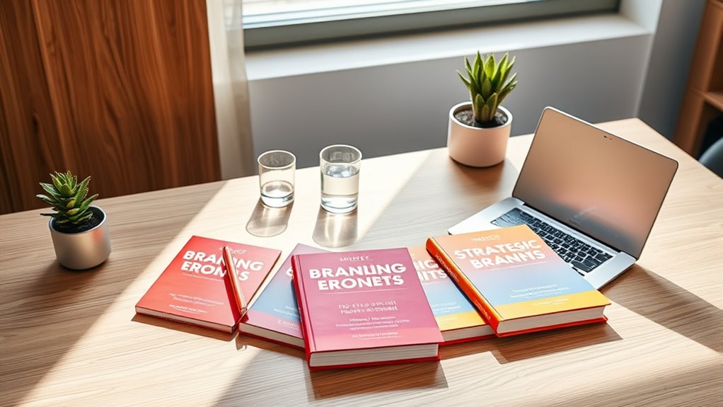 If you’re looking to boost your brand strategy in 2025, I recommend checking out the top nine books that blend theory and practical insights. Titles like *The 22 Immutable Laws of Branding*, *Aaker on Branding*, and *The Brand Gap* offer powerful frameworks to create a clear, compelling identity. For industry-specific tips, consider *The Fashion Business Manual* or *Building a Strategic Brand*. Keep exploring these resources to find strategies that will truly transform your brand approach this year.