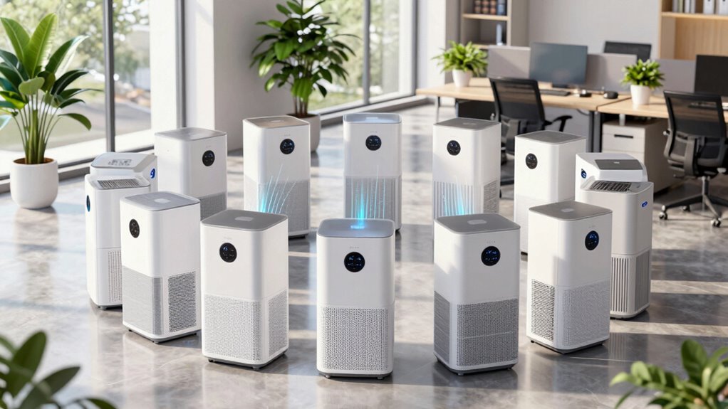 Absolutely, these air purifiers are like a shield against allergens. They effectively capture dust, pollen, pet dander, and mold spores, making the air in your office cleaner and healthier. I’ve seen firsthand how they reduce allergy symptoms and improve air quality. If allergies bother you or your team, investing in a high-quality purifier guarantees you breathe easier. Clean air is just a filter away!