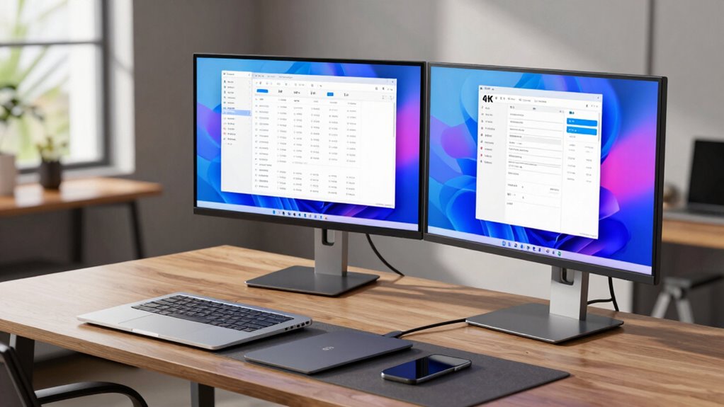 Imagine working outdoors as sunlight dances on your screens—dual monitors can handle bright environments if they have a matte finish and high brightness levels. I’ve used some with anti-glare coatings that reduce reflections, making outdoor use possible. Just keep in mind, direct sunlight can still wash out screens, so shielding them with a hood or working in shaded spots helps. With the right features, outdoor productivity becomes a reality.
