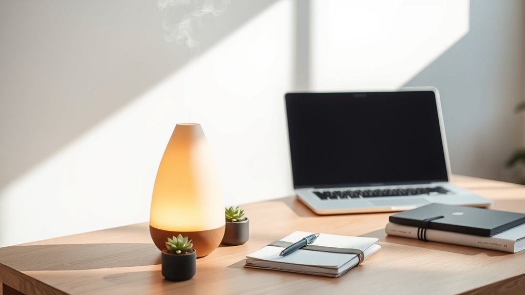 Think of a diffuser as your silent partner in focus—certain types truly excel. I recommend ultrasonic diffusers for their fine mist and gentle scent dispersal, perfect for creating an atmosphere of calm concentration. Nebulizing diffusers are also great, as they deliver pure essential oils without water, sharpening your focus like a crystal-clear lens. Both types help you stay immersed in your work, turning your space into a haven of productivity.