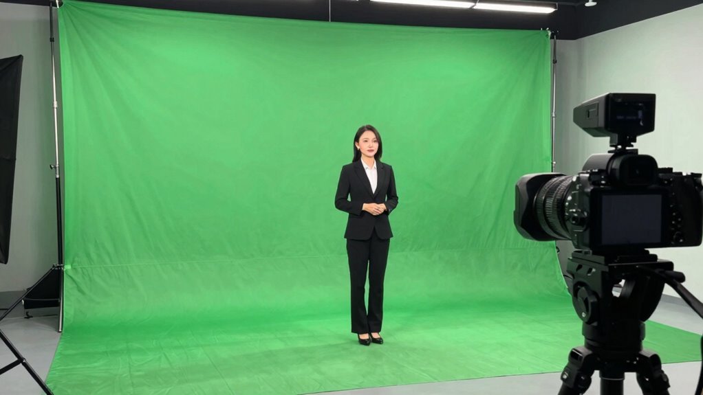 Imagine your lighting as the brushstroke that brings your green screen to life. I recommend using soft, even lighting with diffusers to minimize shadows and prevent color spill. Place lights at a 45-degree angle on either side of your screen, ensuring the green material is evenly lit. Use a dedicated key light on your subject, and keep the background light separate. This setup creates a seamless, professional backdrop for your webinars.