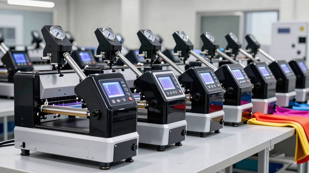 Safety features are essential to guarantee that operating a heat press machine remains secure and worry-free. Auto-shutoff and overheating protection prevent accidents by turning off the machine if it gets too hot or runs idle too long, reducing fire risks. Insulated safety bases and heat-resistant handles minimize burns during handling, making the process safer. Automatic pressure adjustment and digital controls ensure consistent heat application, reducing manual errors that could lead to unsafe conditions. Certified safety standards like UL, FCC, or CE verify that the machine complies with strict electrical and thermal safety regulations. Additional features such as alert signals, emergency stop buttons, and protective covers create a safer work environment, boosting user confidence and preventing mishaps during operation.