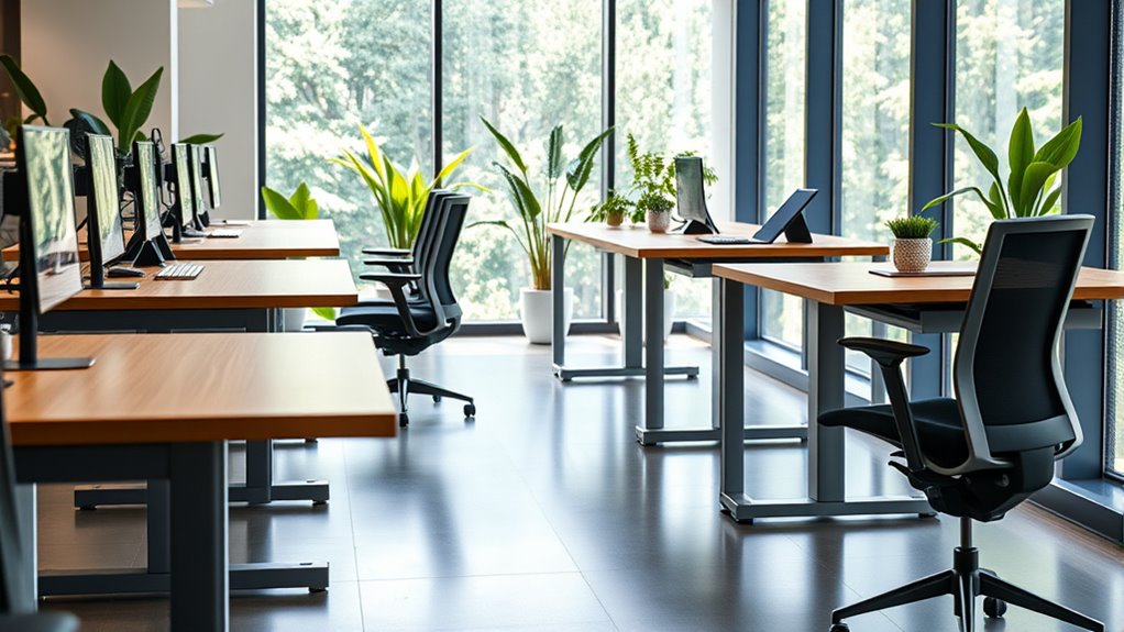 Selecting a height-adjustable desk hinges on choosing a range that matches your ergonomic needs. The adjustability range of desk risers varies from as low as 1.8 inches to nearly 20 inches, giving you plenty of options for comfortable sitting or standing. Many models offer multiple fixed height settings or smooth, continuous adjustments, so you can fine-tune your position. Quick-change mechanisms like single-lever or gas springs make switching between sitting and standing effortless. It’s crucial to match the minimum and maximum heights to your body, ensuring your monitor is at eye level and your keyboard is comfortable. Considering the adjustability range helps you find a desk that adapts to your height and preferences, promoting better posture and reducing strain throughout the day.
