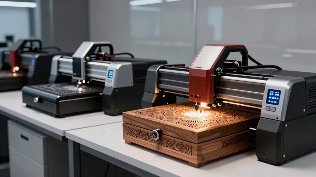 Material compatibility is a critical factor to contemplate because it determines the range of surfaces your laser engraver can effectively work with. High-end desktop laser engravers typically handle a variety of materials like wood, acrylic, leather, glass, ceramics, and coated metals. The laser’s power and wavelength influence what materials and thicknesses you can engrave or cut; higher wattage and specific wavelengths enable working on tougher and more diverse surfaces. Some advanced models can engrave on reflective metals such as stainless steel and aluminum with surface pre-treatments, while others are limited to non-reflective, flammable surfaces. Thickness capabilities also vary, with many supporting cuts up to 6mm. Ensuring compatibility with different finishes and coatings is essential for delivering high-quality, customizable gift results across various materials.
