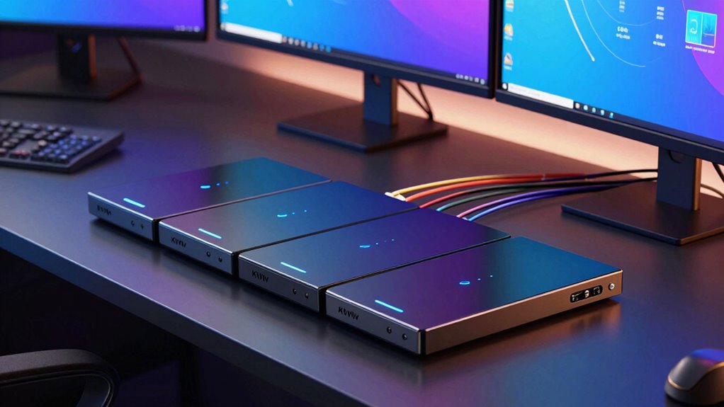 Ever wondered if switching between computers on a premium KVM causes lag? Honestly, I’ve found that high-end KVM switches are designed to minimize latency, often making switching virtually seamless. While some minor delays might occur, they’re usually so quick that they don’t impact my workflow. For the most part, these switches deliver smooth, real-time progressions, ensuring I stay efficient without feeling any noticeable lag.