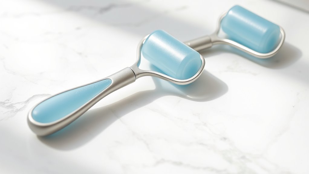 Imagine a gentle glacier melting away your worries—ice rollers can indeed help reduce puffiness and dark circles. I’ve seen firsthand how the cool touch constricts blood vessels, diminishing swelling and brightening tired eyes. Regular use gives your face a refreshed, awake glow, as if dawn has broken on your skin. Just a few minutes of cooling pressure can turn back the clock and revitalize your look beautifully.