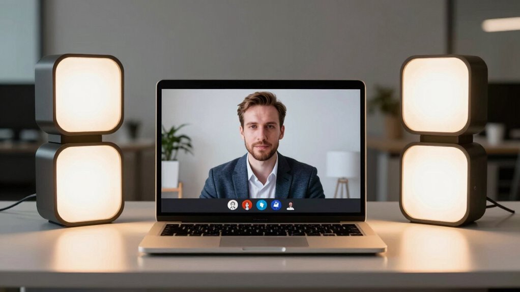 Looking for the best key lights for professional Zoom calls in 2026? I’ve found options with adjustable brightness, color temperature, and high CRI for natural, flattering light. Many are compact, easy to set up, and USB-powered for flexibility. Features like glare reduction and versatile mounting make a big difference. If you want to guarantee your virtual meetings look polished and professional, keep exploring—there’s plenty more to discover that can help elevate your setup.
