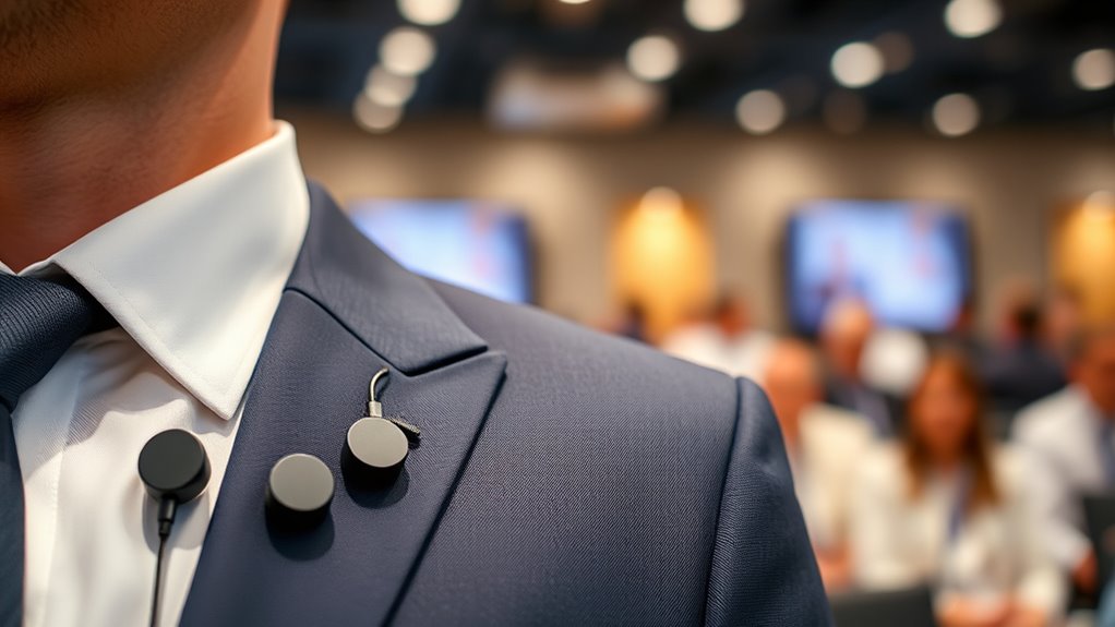 Imagine your conference setup as a well-oiled machine, where each part fits perfectly. I find that most lapel microphones are compatible with standard wireless systems, like UHF or 2.4 GHz, and often connect via TRS or TRRS connectors. Some models even come with USB options for direct plug-and-play. Always check the microphone’s specifications against your equipment to guarantee seamless harmony and exceptional audio clarity.