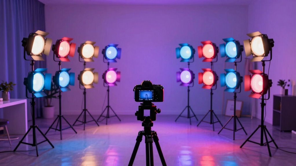 Since great lighting can make or break your TikTok videos, paying attention to lighting quality and diffusion is vital. A high CRI of 95+ ensures your skin tones look natural and vibrant, making your videos more appealing. Diffusers soften the light output, reducing harsh shadows and creating a flattering, even glow. Adjustable brightness levels let you fine-tune the light intensity for various environments and effects. Using diffusion panels or softboxes helps spread light evenly, minimizing glare and hot spots for a professional look. Consistent color temperature control is essential to prevent color shifts during filming, ensuring your lighting remains uniform. Prioritizing these factors helps elevate your TikTok content, giving it a polished, high-quality appearance that stands out.