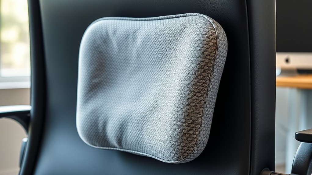 Choosing the right lumbar support cushion involves paying close attention to its ergonomic design features, as these directly impact comfort and proper posture. A good cushion should contour to the natural curve of your spine, providing proper alignment and reducing strain. Look for adjustable elements like straps or height settings, which guarantee a secure fit on different chairs and allow customization for maximum support. The shape matters too—contoured or wedge designs target specific back regions, offering targeted relief. Breathable materials with ventilation promote air circulation, preventing heat buildup during long periods of sitting. Additionally, the firmness level should strike a balance—medium firmness is often ideal, offering enough support without sacrificing softness or causing discomfort. These features work together for ideal comfort and posture support.
