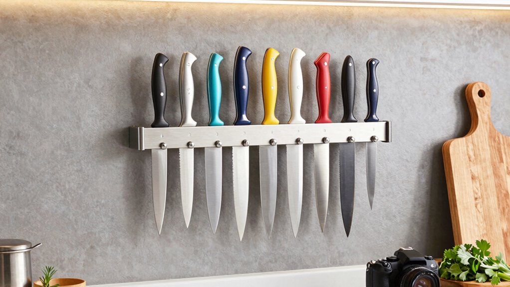 No, magnetic strips won’t turn your knives into dull, sad tools. I’ve used them for years, and my blades stay sharp, thanks to gentle magnetic attraction instead of abrasive surfaces. Sure, some might worry about tiny magnet-induced scratches, but honestly, if you’re worried about dulling, you’re probably more likely to dull your knives chopping carrots than from a magnetic strip. Trust me, your blades are safe—unless you’re trying to stab the magnet.