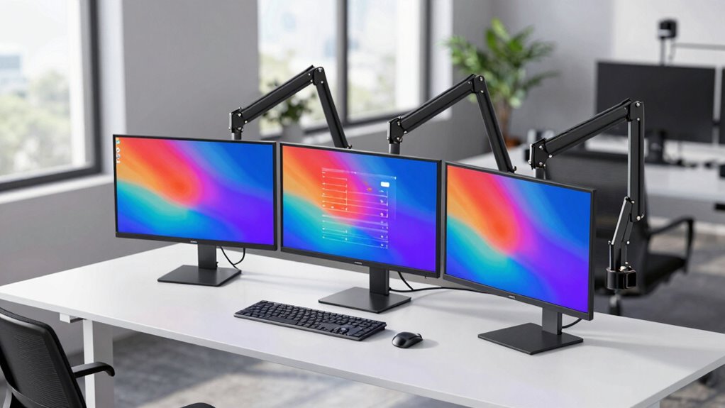 Maximizing desk space is essential for a comfortable workspace, and monitor arms with full motion capabilities make this easy by elevating monitors off the surface. Gas spring or pneumatic arms allow smooth, tool-free adjustments, letting you keep monitors close to the wall or tucked in tight spots. Mounting options like C-clamps and grommets secure the arm without bulky bases, saving valuable surface area. Adjustable arms that fold or slide inward help reduce the footprint when not in use or during storage. Proper cable management integrated into many monitor arms prevents clutter, keeping your desk tidy and open. These features ensure your workspace remains functional and clean, making full use of limited space while providing easy access to adjustments when needed.
