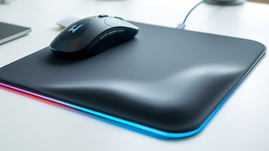Getting the size and compatibility right guarantees your mouse pad fits your workspace and supports proper ergonomics. First, confirm the dimensions suit your desk, giving enough room for smooth mouse movement without feeling cramped. Check that the wrist support’s height and shape align well with your keyboard and mouse setup to promote natural positioning. It’s also essential to verify the surface material matches your mouse type, whether optical or laser, for precise tracking. The overall size should comfortably accommodate both your mouse and wrist support, preventing unnecessary strain. Additionally, consider how the pad fits with your desk or workstation. A well-sized mouse pad shouldn’t cause clutter or instability, ensuring a seamless and ergonomic experience during long hours of use.