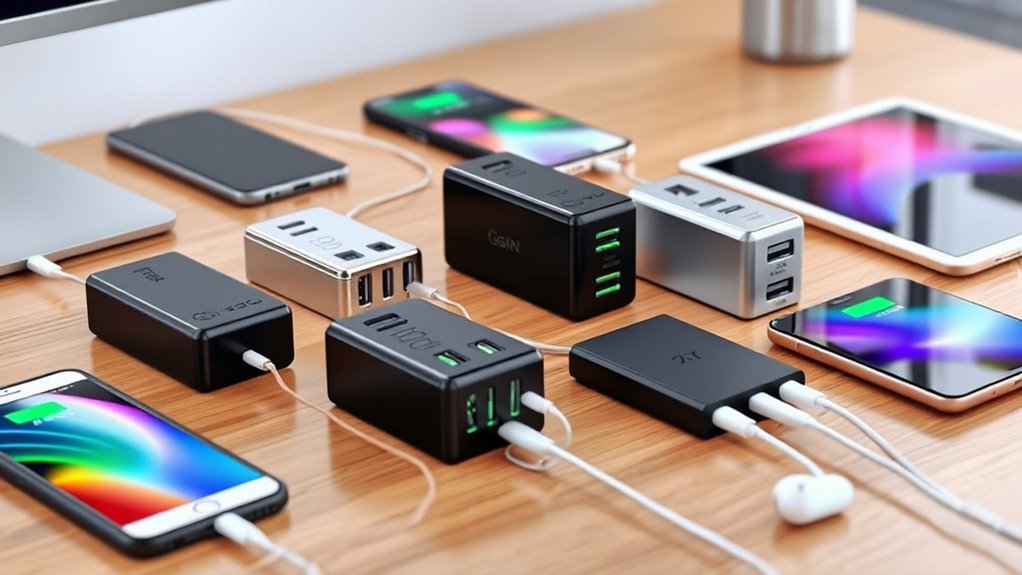 Choosing the right multi-port GaN charger is like assembling a trusted orchestra—you want every device to play in harmony. With the options I’ve shared, you’ll find a solution that powers all your gadgets seamlessly, eliminating clutter and frustration. Remember, a good charger is the conductor that keeps your tech symphony running smoothly. Invest wisely, and your devices will thank you with reliable, effortless performance every time.