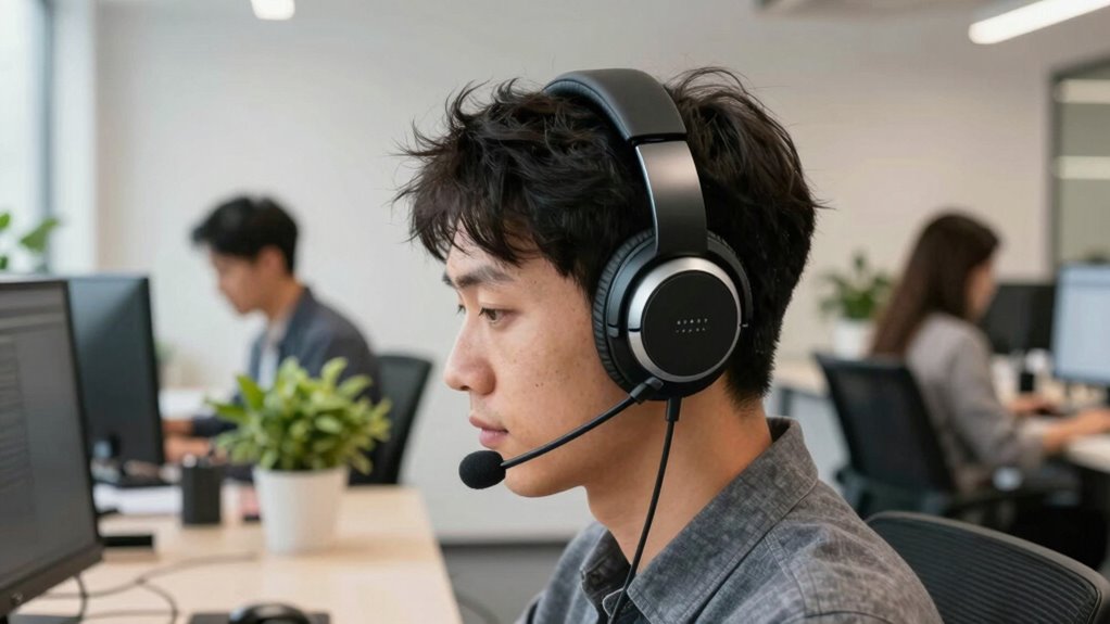 Have you ever struggled to be heard clearly during a call in a busy open office? Microphone clarity is essential for effective communication, and high-quality noise-canceling microphones with noise reduction technology make a big difference. Look for headphones with flexible microphones that can rotate 270° or even 360°, so you can easily adjust them for ideal voice pickup and comfort. Dual-mic noise reduction is a bonus, as it minimizes ambient sounds and guarantees your voice comes through loud and clear despite background noise. A built-in mute function adds privacy control, allowing you to quickly silence your mic during meetings. The placement and adjustability of the microphone directly impact speech intelligibility, making flexibility a key factor in choosing the right headphones for open office work.