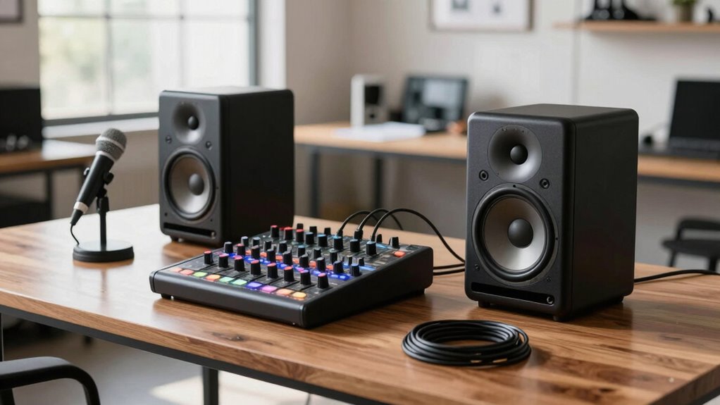 Choosing a PA system with the right sound power and clarity is vital for effective workshops. I look for systems with wattage between 300W and 2000W to guarantee sound reaches every corner without distortion. High peak power and RMS ratings matter because they ensure both loudness and clear audio. I also focus on the frequency response—ideally 40Hz to 20kHz—to reproduce deep bass and crisp treble, making speech and music sound natural. Low Total Harmonic Distortion, around 1% or less, is imperative for maintaining fidelity at higher volumes. Well-designed speakers and drivers are also key, as they produce balanced sound and prevent muddiness. Together, these factors ensure your workshop audio is loud, clear, and professional.