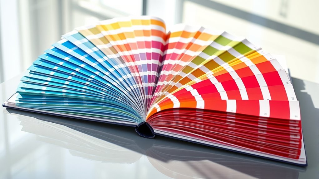 Pantone guides help me guarantee color consistency across different media by providing standardized color references that everyone can rely on. I use their color swatches to match shades precisely, whether on digital screens or print materials. This way, I avoid surprises and maintain a cohesive look. The guides serve as a universal language for color, making sure my designs look consistent no matter where they appear.