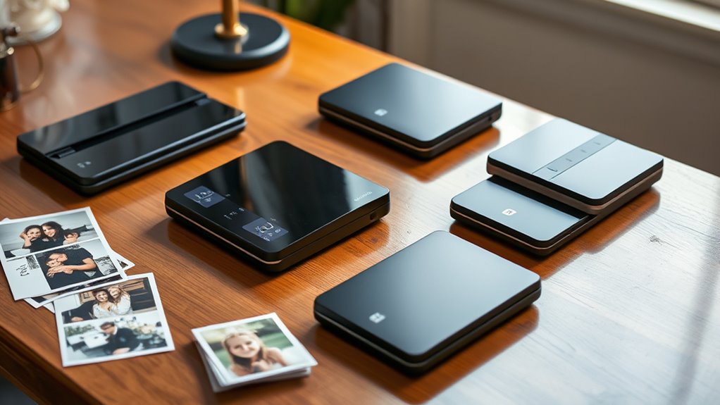 If you’re looking to effortlessly digitize your memories, I recommend exploring some of the top portable photo scanners like the Epson ES-50, Plustek Z300, and handheld models with high resolutions up to 900 DPI. These devices are compact, fast, and perfect for photos, documents, and even negatives. They often connect via USB or support SD cards, making on-the-go scanning simple. Keep in mind features like resolution, speed, and software—if you continue, you’ll discover the best options for your needs.