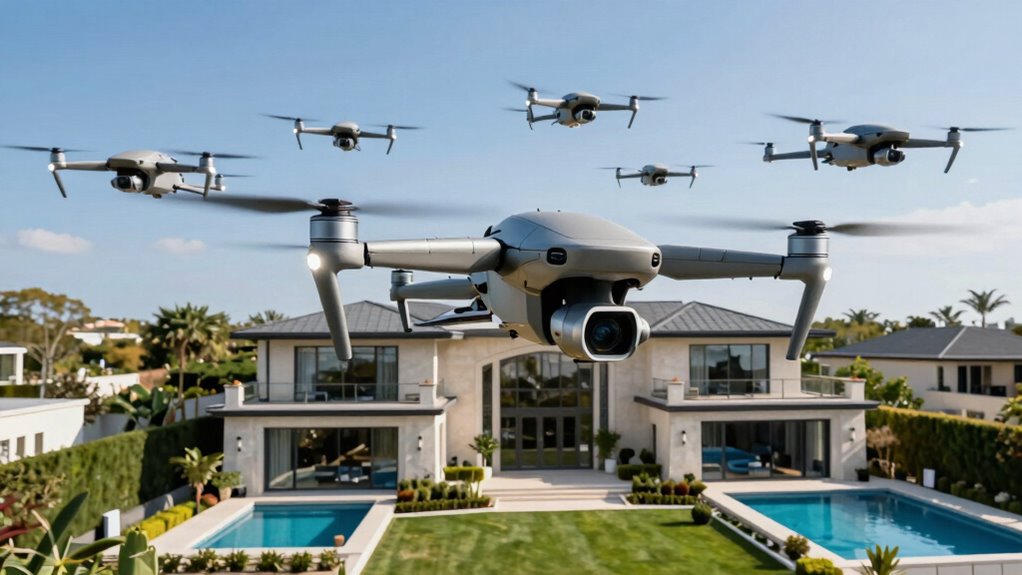 Have you ever wondered how top-tier creator drones capture stunning real estate visuals? It all comes down to camera quality and resolution. Drones equipped with 4K or even 8K cameras produce sharp, detailed images that highlight every feature of a property. An adjustable lens angle and gimbal stabilization guarantee smooth, professional footage free of shake or blurriness. Larger CMOS sensors improve low-light performance, so your shots stay clear during dusk or cloudy days. Multiple camera settings, like HDR and night modes, help capture well-exposed images under different lighting conditions. Additionally, a wider field of view—around 90° or 110°—allows for expansive shots that showcase entire properties or scenic surroundings. High-quality visuals truly elevate your real estate marketing game.
