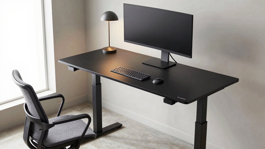 Building a durable electric standing desk requires selecting high-quality materials that can withstand daily use. Premium desks typically feature steel frames and engineered wood, ensuring long-term strength and stability. Industrial-grade steel and reinforced joints support higher weight capacities, often up to 220 pounds or more, providing confidence in their durability. These desks undergo rigorous testing, including over 50,000 to 100,000 lift cycles, to verify their stability and lifespan. Eco-friendly, low-VOC materials are common, meeting safety standards and reducing environmental impact. Well-constructed desks also have thick desktops, usually 0.75 inches or more, and reinforced frame designs to prevent warping or damage over time. Prioritizing high-quality materials guarantees your investment in a reliable, long-lasting workspace.