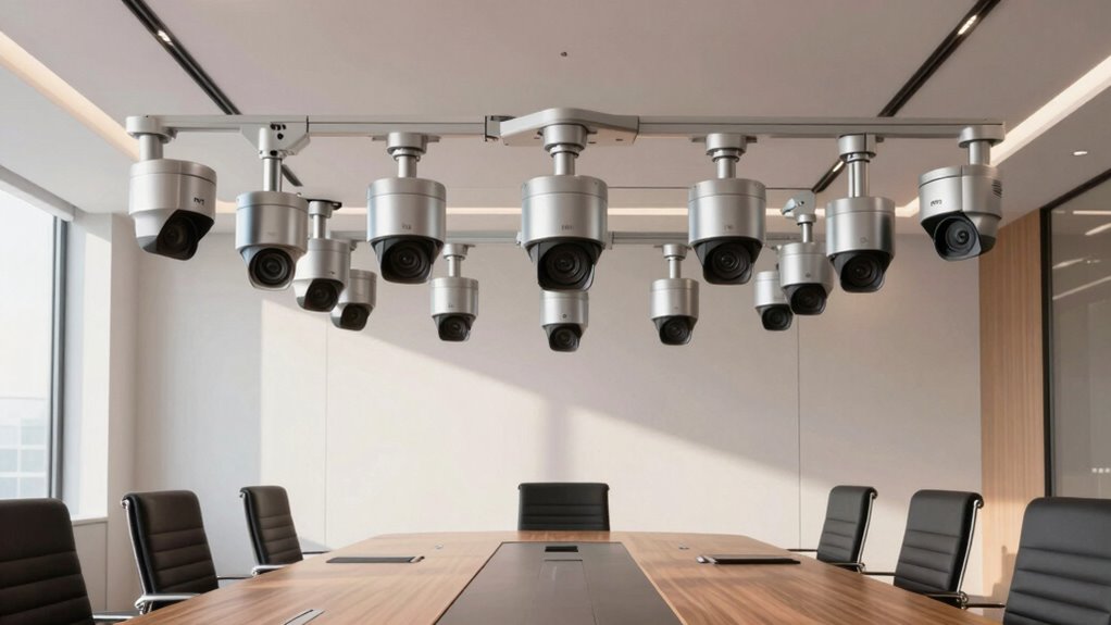 Mounting methods matter most for maximizing motion and meeting coverage. I recommend ceiling mounts for a clean, thorough view that captures every corner. Wall mounts are versatile, providing flexible angles and easy access for adjustments. Tripods offer portability but lack stability for permanent setups. Whichever you choose, ensure it’s sturdy, secure, and strategically positioned to cover the conference room’s key zones, enhancing engagement and ensuring effective communication.