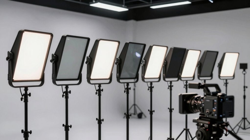 Choosing a premium teleprompter means paying close attention to its lighting and reflection technology, as these factors directly impact script clarity and overall professionalism. Advanced reflection tech, like multilayer dielectric coatings on beamsplitter glass, minimizes light loss and keeps the script sharp. Proper lighting is essential to prevent glare and reflections that could obscure the screen or cause double images. High-quality units often feature adjustable glass angles and anti-reflective coatings, enhancing contrast and readability across different lighting conditions. Using diffused, soft lighting reduces harsh reflections and ensures even illumination, boosting text clarity. Additionally, controlled lighting environments help maintain consistent reflection quality, especially outdoors or in bright settings. These elements together ensure your teleprompter delivers clear, professional results every time.
