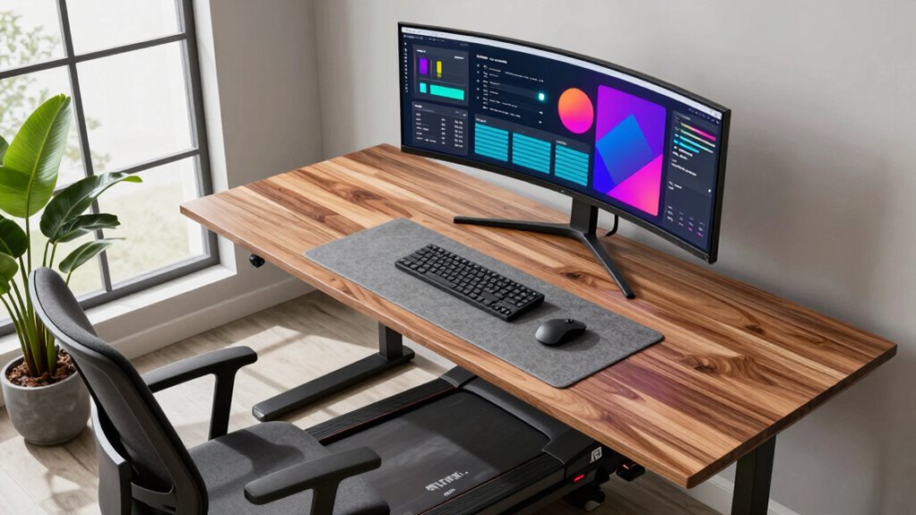 Adjusting the speed and incline of your treadmill desk can greatly enhance your comfort and workout effectiveness. A versatile treadmill should offer adjustable speeds from 0.6 to at least 4.0 MPH, letting you walk, jog, or run while working. Incline options, whether manual or motorized, up to 15%, help target different muscle groups and increase workout intensity. Higher speeds enable more dynamic movement, but safety features like emergency stops and sturdy handrails are essential at these levels. Multiple presets for speed and incline make it easy to switch between different workout intensities without manual adjustments mid-use. Customizable settings support a wide range of fitness goals, from light activity to high-intensity interval training, all within a single, adaptable treadmill desk.