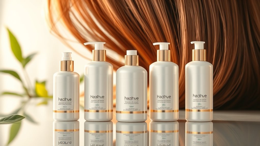 To guarantee long-term health for dry, damaged hair, it’s essential to select products that promote strength and resilience over time. I look for deep conditioning treatments rich in proteins like keratin and collagen, which rebuild and reinforce hair strands gradually. Incorporating leave-in conditioners with bond-repair ingredients, such as Rescuplex, helps maintain hair integrity and prevents breakage. I also prioritize gentle, sulfate-free shampoos that keep the pH balanced, supporting the hair’s natural barrier and reducing dryness. Protecting my hair from heat with sprays and limiting high-heat styling is *fundamental* for longevity. Regular trims and avoiding harsh chemical treatments minimize stress on my hair, helping it stay healthy and vibrant in the long run.