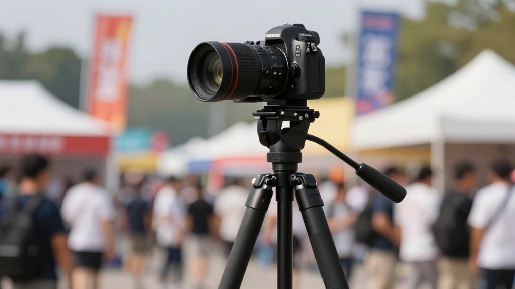 When choosing a professional camera tripod for events, I focus on stability and durability to guarantee reliable shots. It’s also important to take into account height adjustability, compatibility with my devices, and how portable the tripod is for easy transport. Finally, I look for models that are simple to operate so I can set up quickly and focus on capturing the moment.