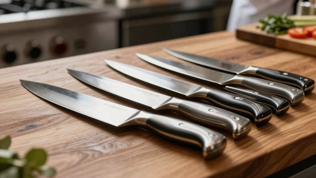 Think of a knife handle as the steering wheel of your culinary journey. A well-designed handle fits like a glove, providing balance and control, making slicing feel smooth and effortless. Ergonomic shapes reduce fatigue during long prep sessions, while textured grips prevent slips. When handle design aligns with your hand’s rhythm, it turns cutting from a chore into a dance—enhancing performance and comfort every step of the way.