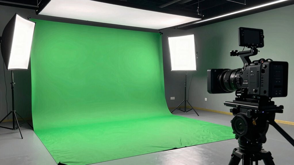 Choosing the right lighting setup is essential because it directly impacts the green screen’s effectiveness during live streams. Proper lighting ensures even illumination, reducing shadows and hotspots that can disrupt chroma keying. I recommend using soft, diffuse light sources to minimize reflections and glare on the fabric surface, which is crucial for a clean key. Additionally, the lighting angles should prevent spill or color contamination onto your subjects, maintaining a crisp separation between foreground and background. Adjustable lighting allows me to keep brightness levels consistent, which is important for maintaining uniformity during prolonged streams. High CRI (Color Rendering Index) lights are a game-changer, as they enhance color accuracy and make keying much easier, resulting in a more professional and polished appearance.