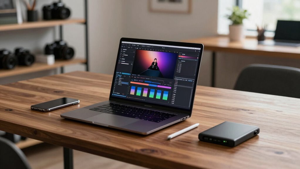 Ensuring that a high-end laptop supports the latest creative software versions and industry-standard plugins is essential for seamless workflow and productivity. I look for devices with operating systems that guarantee compatibility with current software updates, minimizing technical hiccups. Hardware specs like a powerful CPU, GPU, and ample RAM are critical for smooth performance during resource-heavy tasks. I also prioritize high-resolution, color-accurate displays with wide gamuts such as DCI-P3 or AdobeRGB for precise editing and color grading. Connectivity options like Thunderbolt 4, HDMI 2.1, and USB-C ports are indispensable for connecting external monitors, drawing tablets, and peripherals effortlessly. Additionally, hardware features like hardware-accelerated encoding and compatibility with calibration tools ensure ideal performance, making the creative process efficient and reliable.
