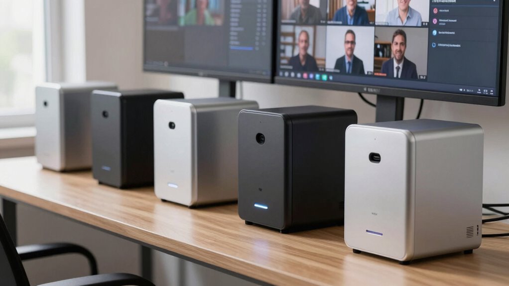 If you’re looking for the 15 best professional mini PCs for webinar stations in 2026, I’ve got just the list. These models feature powerful Ryzen and Intel processors, support multiple 4K or even 8K displays, and offer extensive upgrade options with high-speed RAM and storage. Connectivity is premier with WiFi 6E, Thunderbolt 4, and multiple USB ports. Built for durability and thermal efficiency, they guarantee reliable, uninterrupted sessions. Keep going to discover the key features that make each stand out.