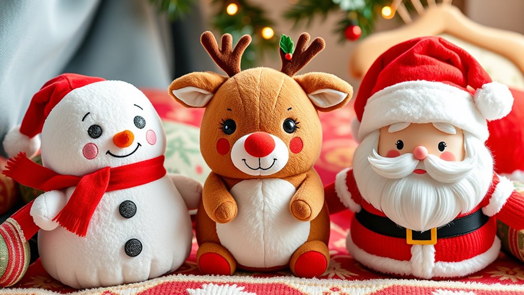 Choosing holiday-themed Squishmallows for your collection or as gifts means paying attention to their seasonal designs and details. These plush toys often feature festive elements like Christmas trees, gingerbread, or Santa hats that boost their holiday appeal. Picking the right theme can make them perfect as seasonal decorations or thoughtful gifts during specific celebrations. Many themed Squishmallows include special touches like holiday colors, patterns, or accessories, which add to their collectible value. Considering the holiday theme also helps guarantee the Squishmallows match the recipient’s festive preferences and traditions. Since limited edition holiday designs are released annually, recognizing the theme is key for collectors wanting to stay current and complete their holiday lineup.